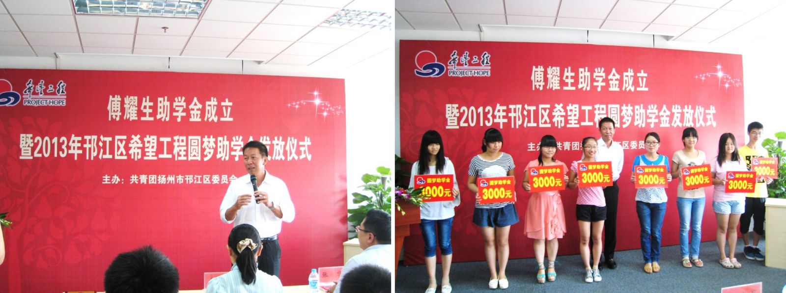 2013年8月27日,“傅耀生助學(xué)金”在揚州成立。啟動儀式上,50名剛剛被高校錄取的貧困學(xué)生,在共青團揚州市邗江區(qū)委員會的帶領(lǐng)下,在利星行機械(揚州)有限公司接受了傅耀生先生的現(xiàn)場捐贈。傅先生表示,能幫助這些經(jīng)濟困難的優(yōu)秀高中畢業(yè)生順利進入高校深造是他本人的心愿,希望這些孩子們努力學(xué)習(xí),畢業(yè)后回到揚州做貢獻,而利星行機械的大門也將為他們敞開。
